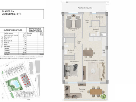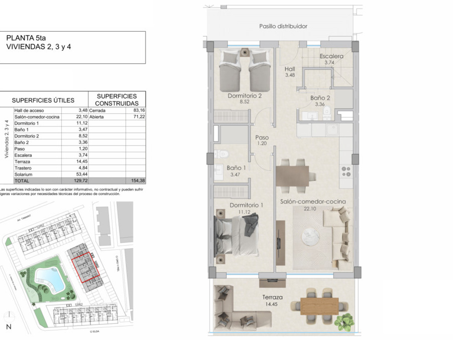 Caractéristiques: 3 chambres, 2 salles de bain, Cuisine, Salle à manger, Salon ouvert, Terrasses de 14,45 m2, Solarium de 53,44 m2….etc….