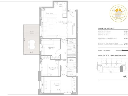 Caractéristiques : 3 chambres, 2 salles de bain, Cuisine ouverte, Salle à manger, Salon, Terrasse 11,18 m2 ....