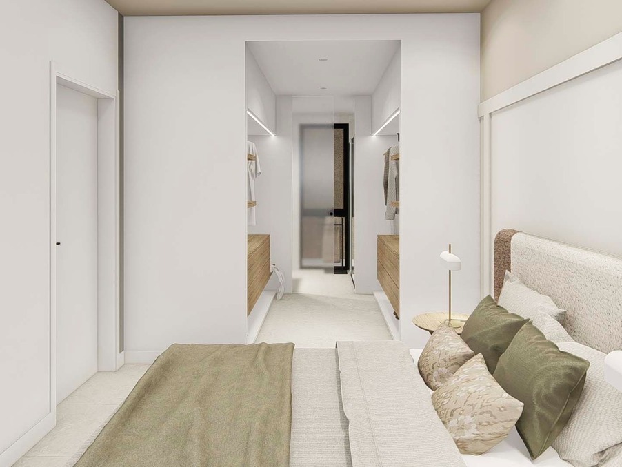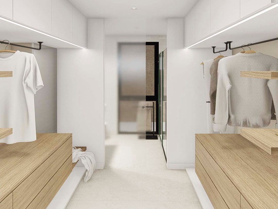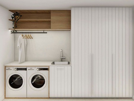 Cuisine entièrement aménagée et équipée: Hotte, plaque à induction, réfrigérateur intégré, lave-vaisselle intégré, microonde, four, lave-linge et sèche-linge.