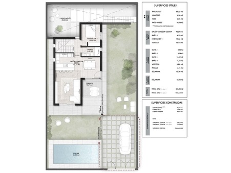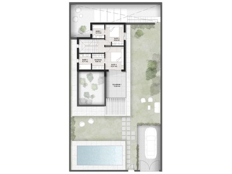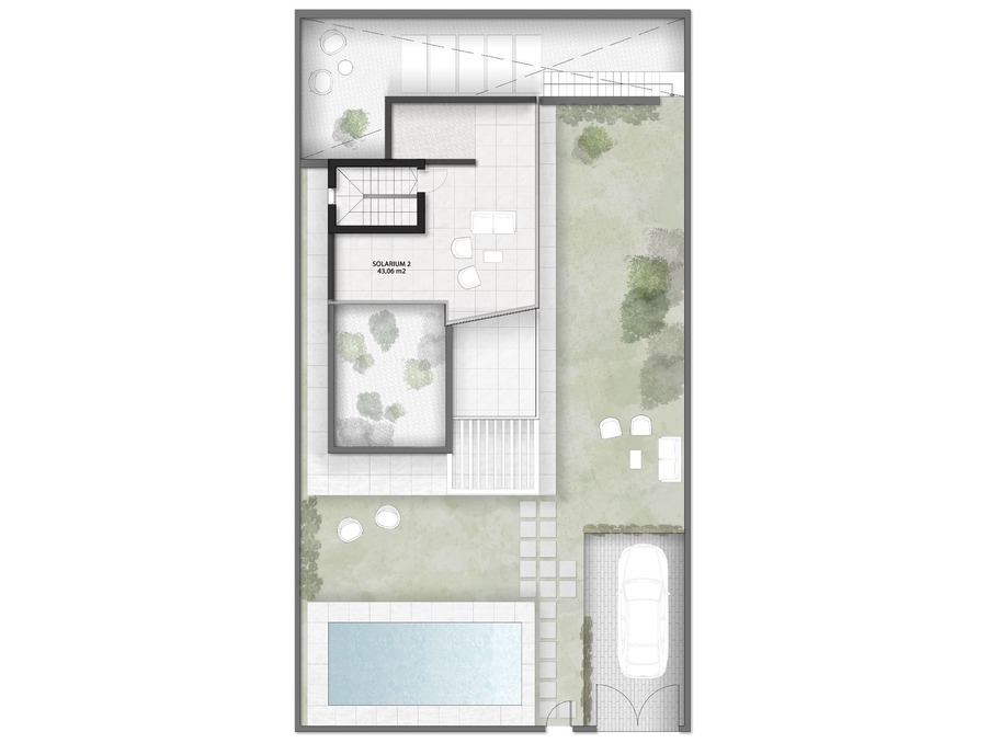 Caractéristiques: 3 chambres, 3 salles de bain, Cuisine ouverte, Salle à manger, Salon ouvert, Terrasse 1 de 15,71 m², Terrasse 2 de 12,36 m², Solarium de 43,06 m2, Jardin ….etc….