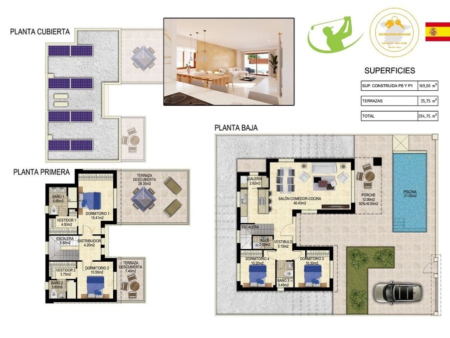Caractéristiques : 4 chambres, 3 salles de bain, 1 wc, Cuisine ouverte (la cuisine est complétement équipée), Salle à manger, Salon ouvert, Terrasses de 35,75 m², Piscine ……
