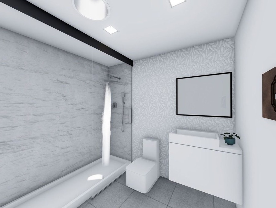 Cuisine équipée avec plan de travail et façade en Silestone, appareils électroménagers (lave-linge, four, plaque vitrocéramique, hotte aspirante, lave-vaisselle, réfrigérateur et aérotherme.