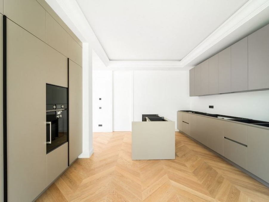 La cuisine entièrement équipée avec des appareils électroménagers de pointe dispose d'un îlot fait sur mesure.