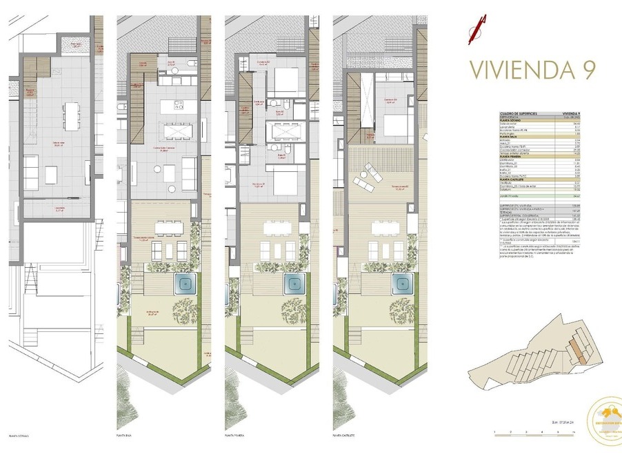 Ces maisons impressionnantes, réparties sur 4 étages, comprennent 3 chambres, 2 salles de bain et une salle d'eau, un vaste sous-sol, un parking privé, un jardin, un solarium et plusieurs terrasses.