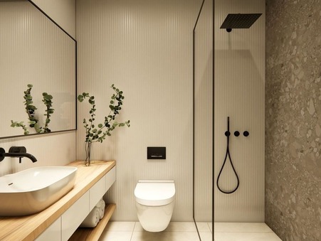 Sols chauffants dans les salles de bains. Salles de bains entièrement équipées avec toilettes, meuble-lavabo, miroir, douche avec effet pluie.