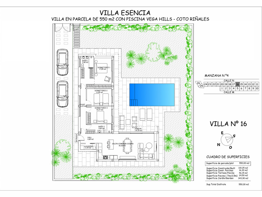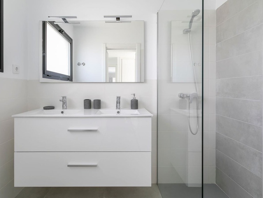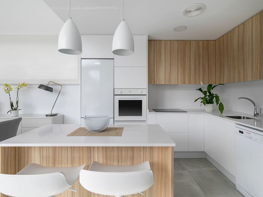 - Cuisine équipée avec plan de travail et façade en Silestone et appareils électroménagers (lave-linge, four, plaque vitrocéramique, hotte aspirante, lave-vaisselle et réfrigérateur, aérotherme de 150 litres.